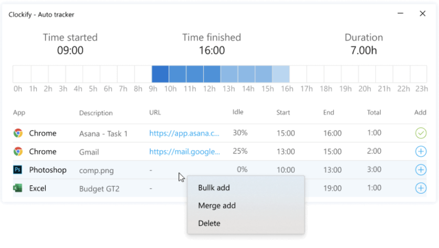 Available on the desktop app. Auto Tracker runs in the background and records which applications, websites, and documents you spend time on. It doesn't create time entries automatically - instead, it gives you a timeline you can review and convert into logged entries at the end of the day.