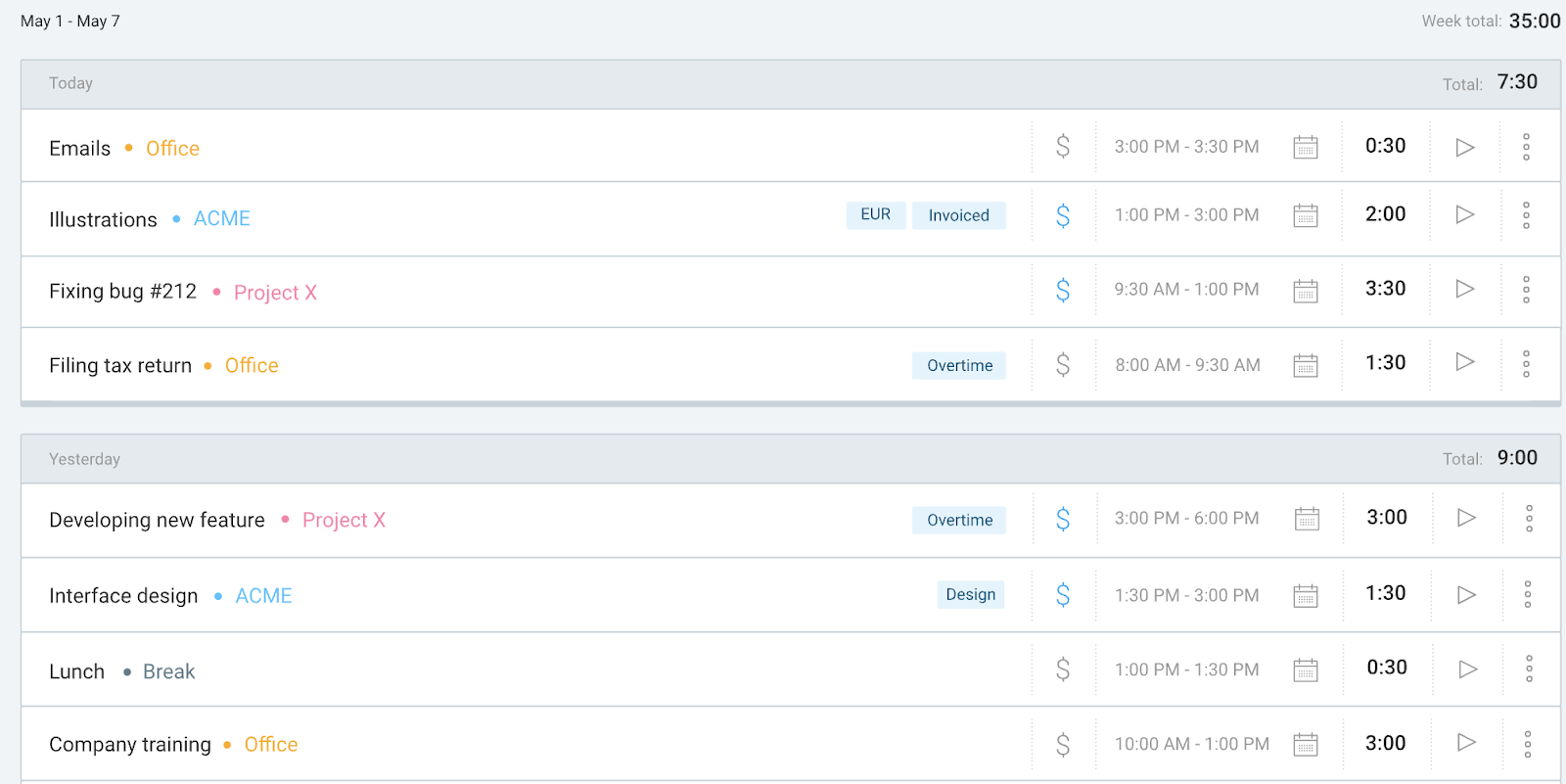 Manual entry: Add time after the fact by typing in the start and end time. Useful for people who prefer to log at the end of the day.